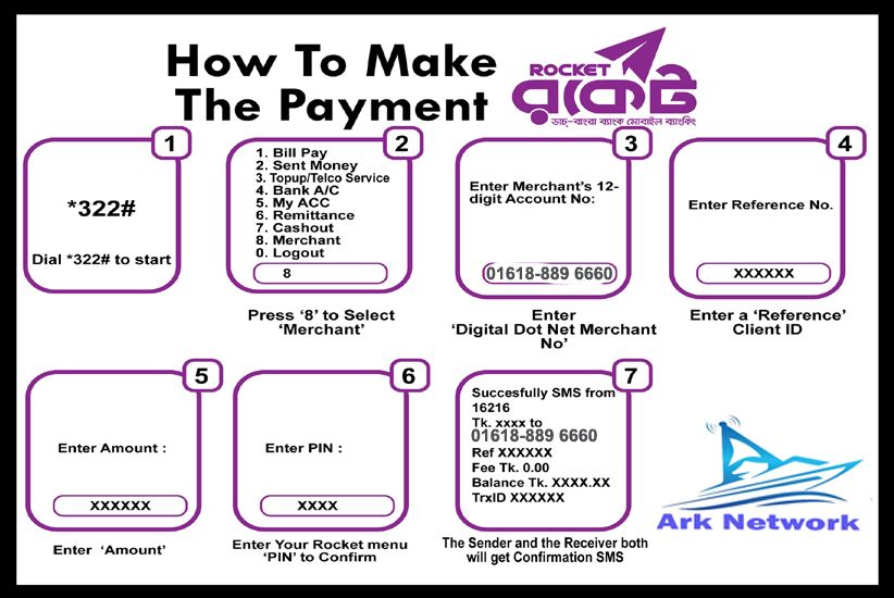 BILL PAY bKash 1. Press *247#2. Select Payment Option3. Enter Merchant bKash Wallet No: 01618-889 6664. Enter Amount: Like 10005. Enter Reference No(Customer ID): 123456. Enter Counter No: 17. Enter Menu PIN to Confirm: 12348. Payment successful. Rocket 1. Press *322#2. Select Merchant (8 No)3. Enter Merchant No: 01618889604. Enter reference Client ID.5. Enter Amount”= XXXXXXX6. Enter PIN: 7. Successful SMS. Nagod